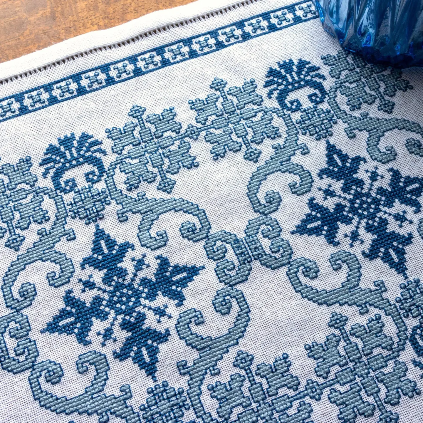 The Stavroula folk embroidery kit design is a favorite among needleworkers in Greece. A simple two-tone palette with a light shade outlined in a darker shade is a classic technique used in many folk embroideries and is shown here to great effect. The delicate scroll work, two cross motifs, and a small palmette flourish create a design resplendent with ancient art motifs.