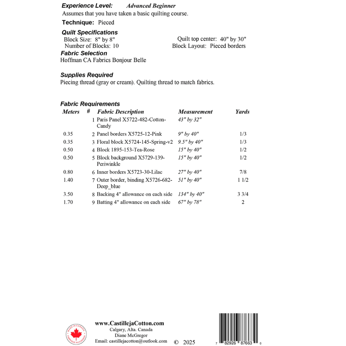 Paris Roses quilt pattern features a lovely fabric panel featuring the Eiffel Tower with pieced on point diamond border. The pattern easily adapts itself to any panel (43" x 32") and the borders help make it pop! Fabric shown in the sample quilt is Hoffman CA Fabrics Bonjour Belle.