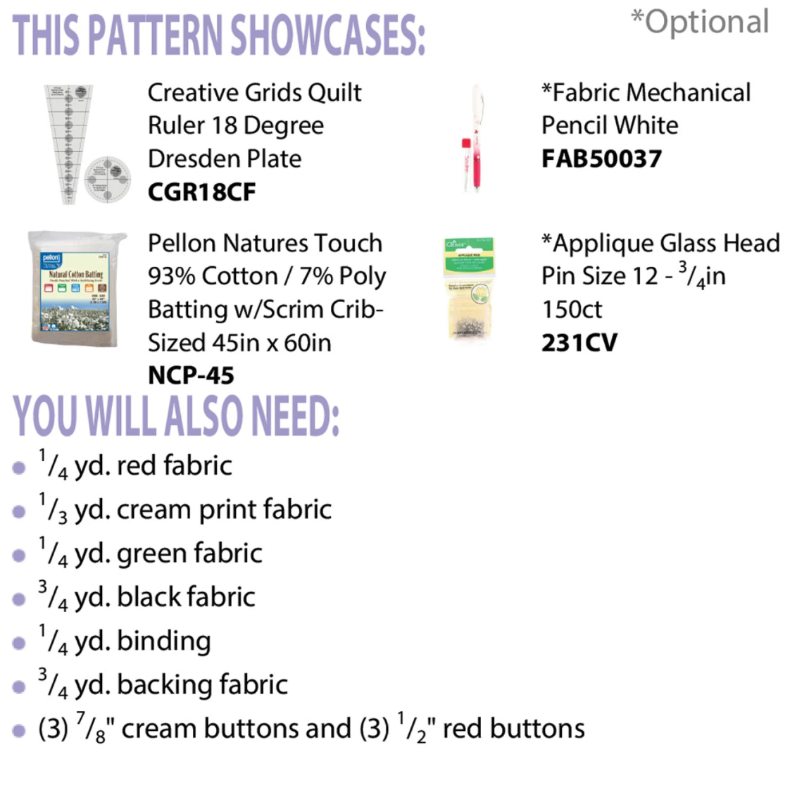The stripes on the candy canes are cleverly created with units cut with the Creative Grids 18 Degree Dresden Plate Ruler. Even the holly is cut with this tool! What a darling centerpiece for the holidays!