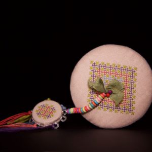 Two sides are required to make one tambourine. The design area of one side is 15 stitches (w) x 15 stitches (h). Each side requires a 2” margin for finishing. The sizes given below are for one side of the tambourine.