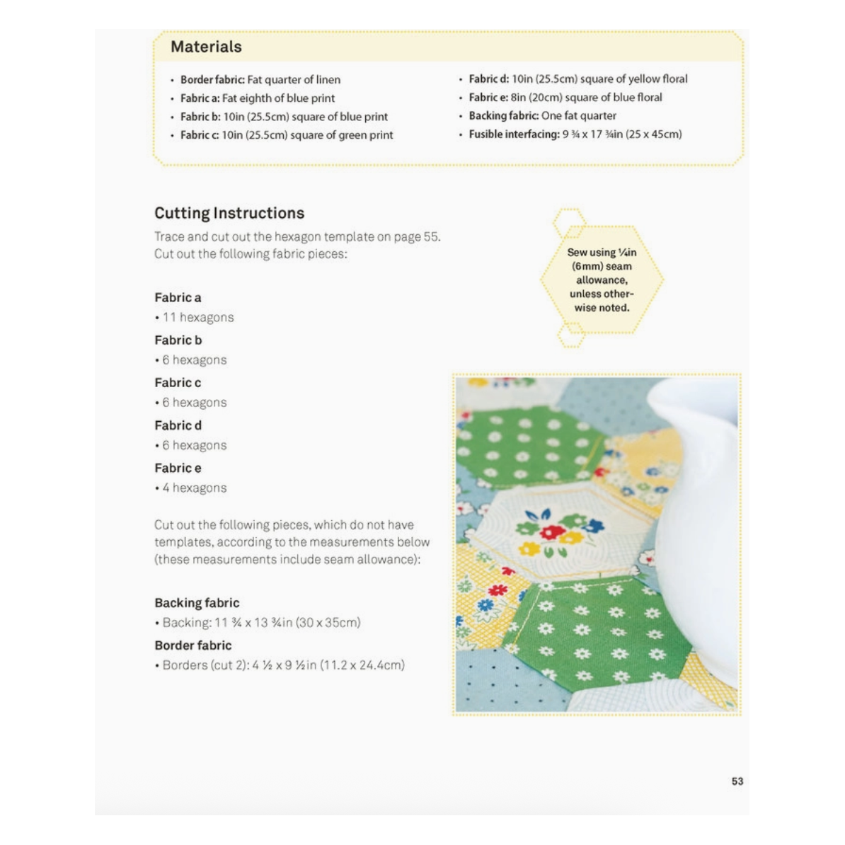Discover the obsession taking the quilt world by storm: hexies. Learn how to construct these cheerful little shapes, and then use them to create unique patchwork projects. Step-by-step color photos illustrate various hexie techniques, including English paper piecing, hand-pieced inset seams, and special hexagon-specific quilting methods—you’re sure to learn something new, even if you’re a veteran hexie maker!