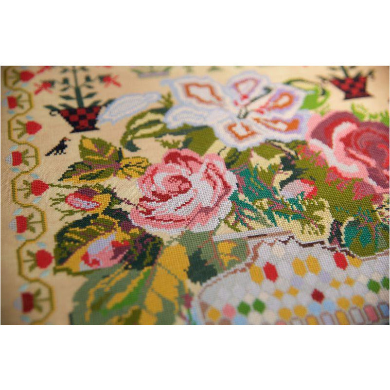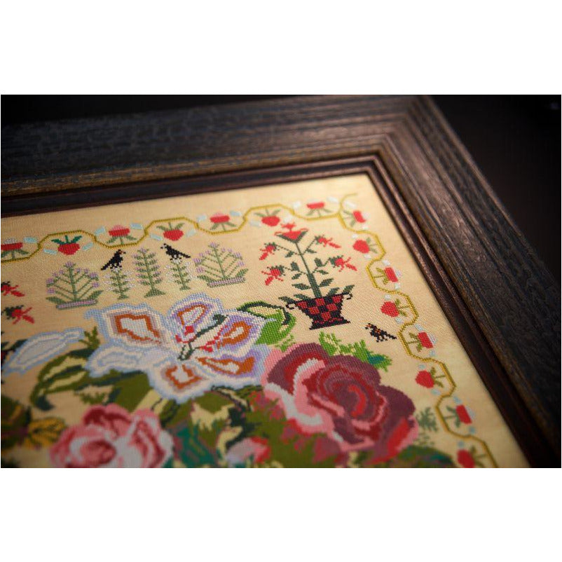 The sampler is stitched with mainly cross stitch over two linen threads and has some satin stitches.