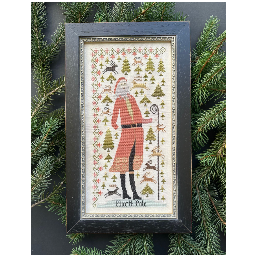 This design is named North Pole. This rather large Santa is stitched on 40-Count Flannel Flower from Fox & Rabbit. The stitch count is 109 Wide by 212 High. Needlepoint Silks used are: 202, 205, 222, 241, 242, 243, 245, 473, 511, 692, 693, 704, 763, 911, 955, 961, 976, 991, 993. Two skeins of 205 will be needed. Only five stitches are made with 202.