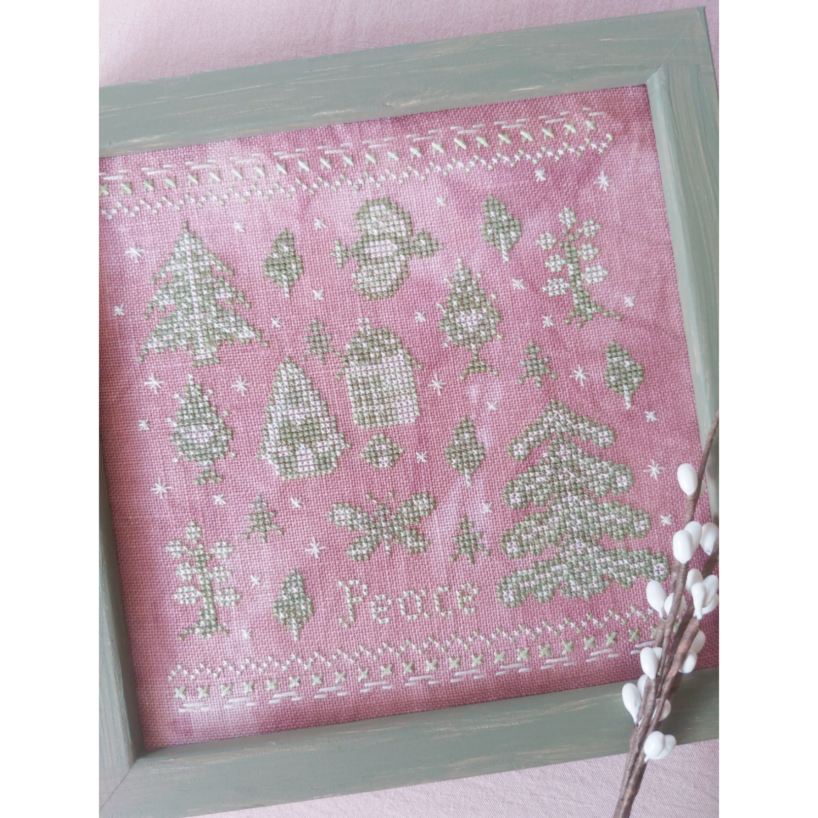 Threadlist: CHE 725O mid-pine green,CHE 7595 light pine green, CHE 1120 Ecru. DMC conversion: 3347, 3053, Ecru.