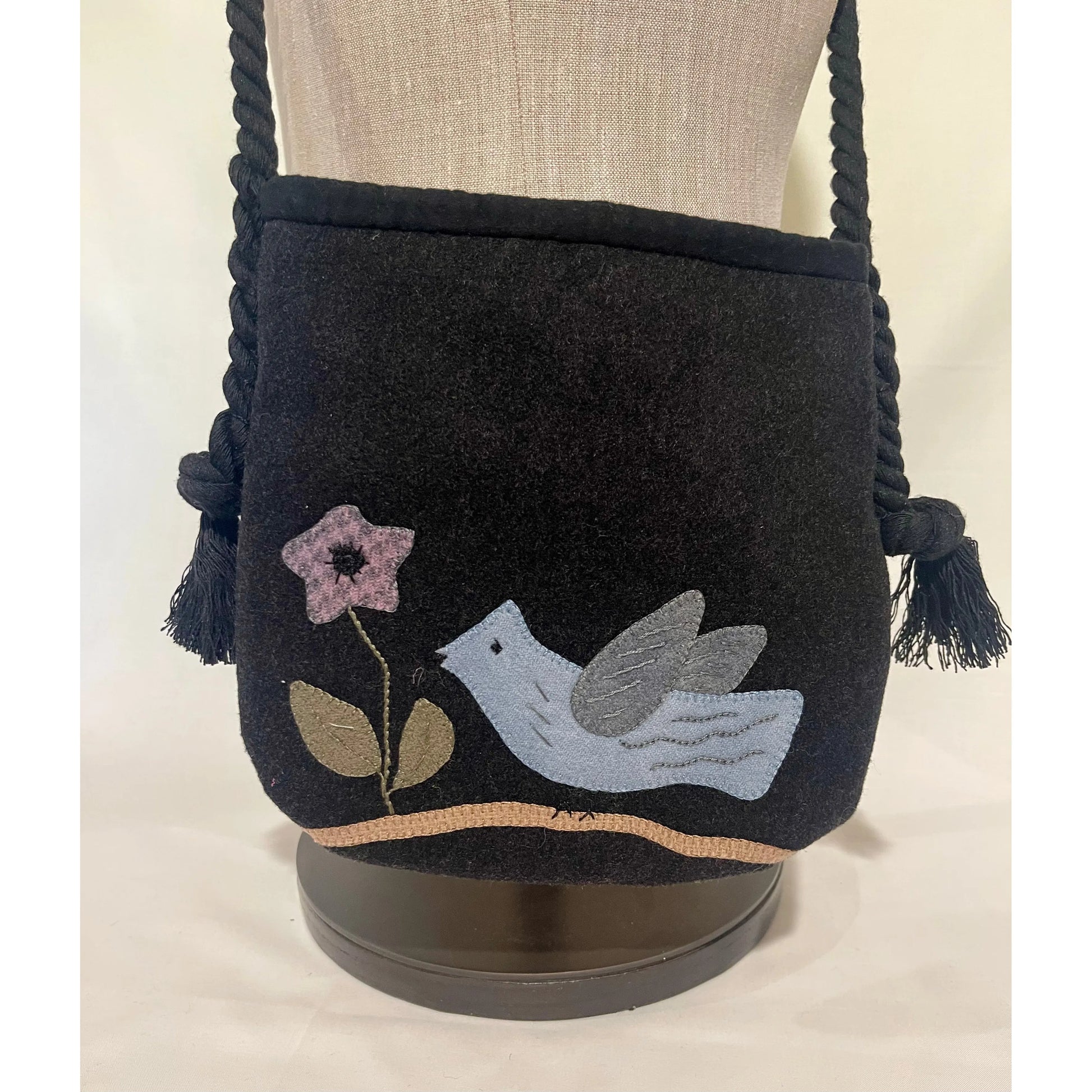 Paxe has done it again, bringing us a gorgeous handmade, hand-embroidered wool purse! The front features a blue bird singing on a branch, while the back has her nest with two tiny eggs in it.