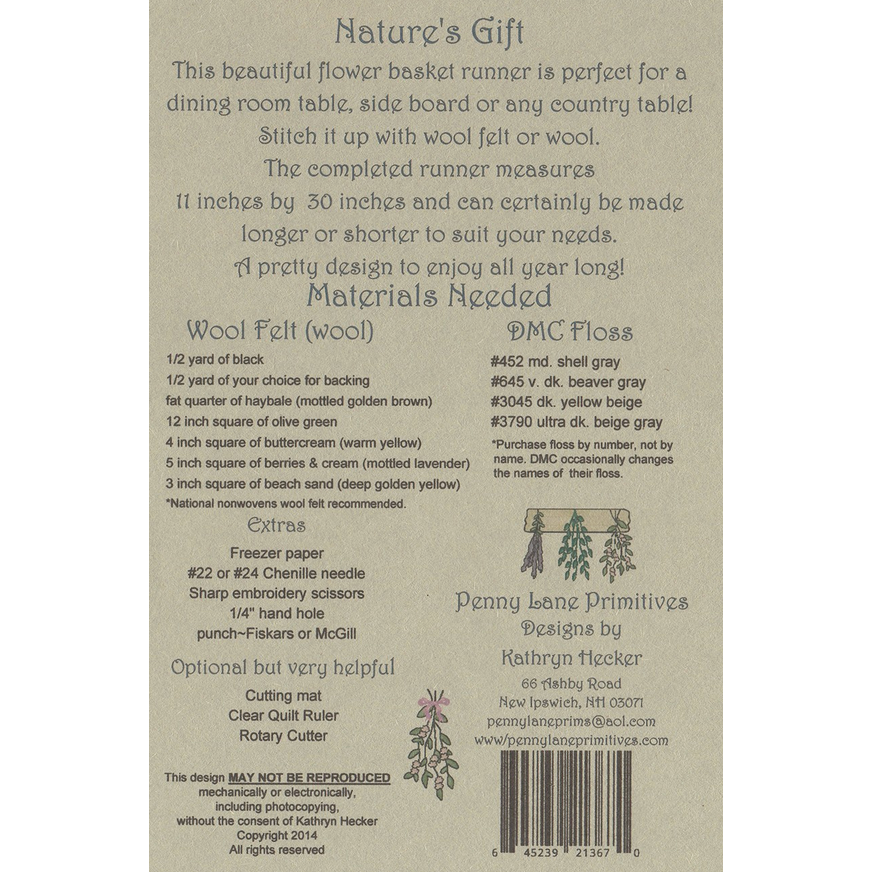 This beautiful flower basket runner is perfect for a dining room table, side board or a primitive country table! Stitch it up with wool felt or wool. The completed runner measures 11 inches by 30 inches and can certainly be made longer or shorter to suit your needs. A pretty floral design to enjoy all year long!