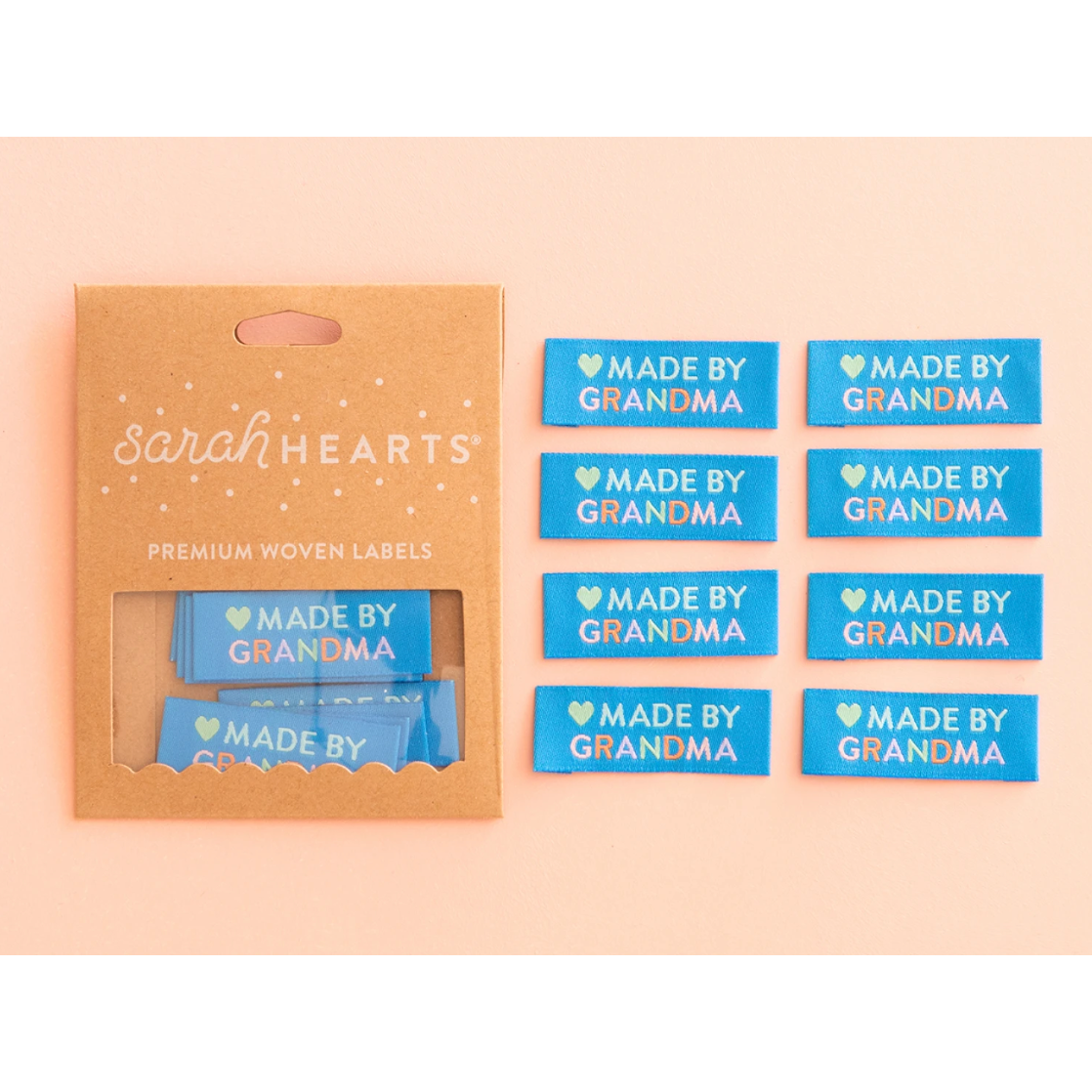 Made by grandma! Proudly finish all your baby, kids, quilt, and gift handmade projects with love and with these adorable woven labels. High quality, blue woven labels feature mint green text. They are soft to the touch and never scratchy. The labels are fully washable and can handle the heat of the dryer.