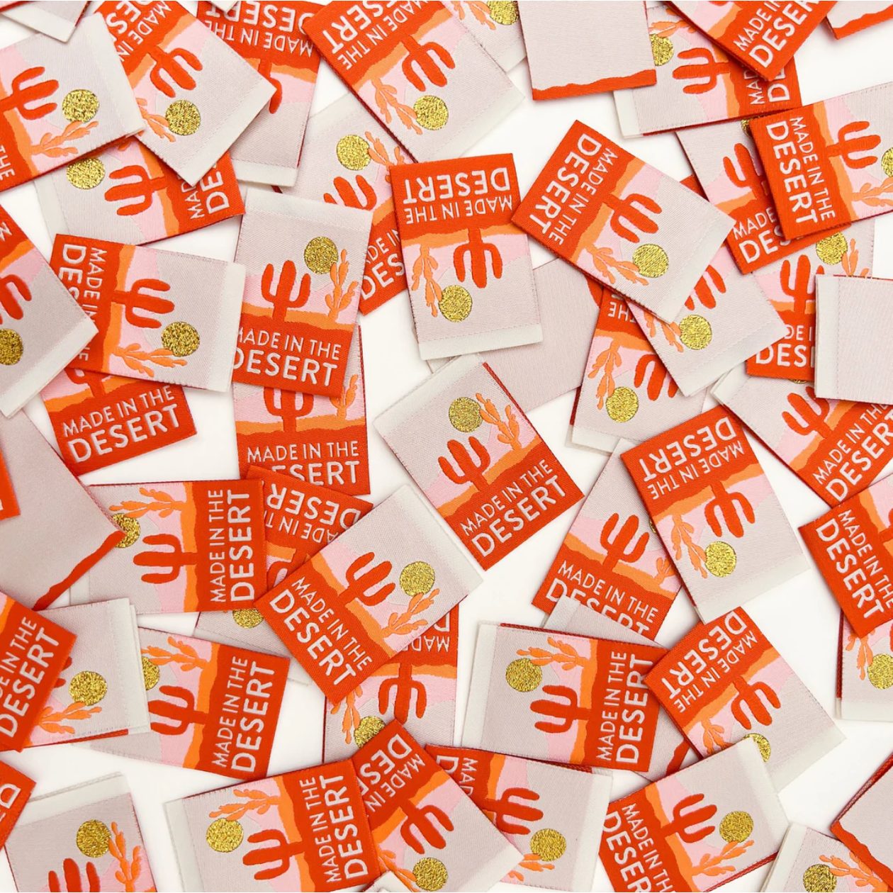 Is the desert your vibe? Finish all your handmade makes with these gorgeous woven labels. Each label features the text "made in the desert," a rust landscape and a small metallic gold sun. They are super soft to the touch and never scratchy. The labels are fully washable and can handle the heat of the dryer.