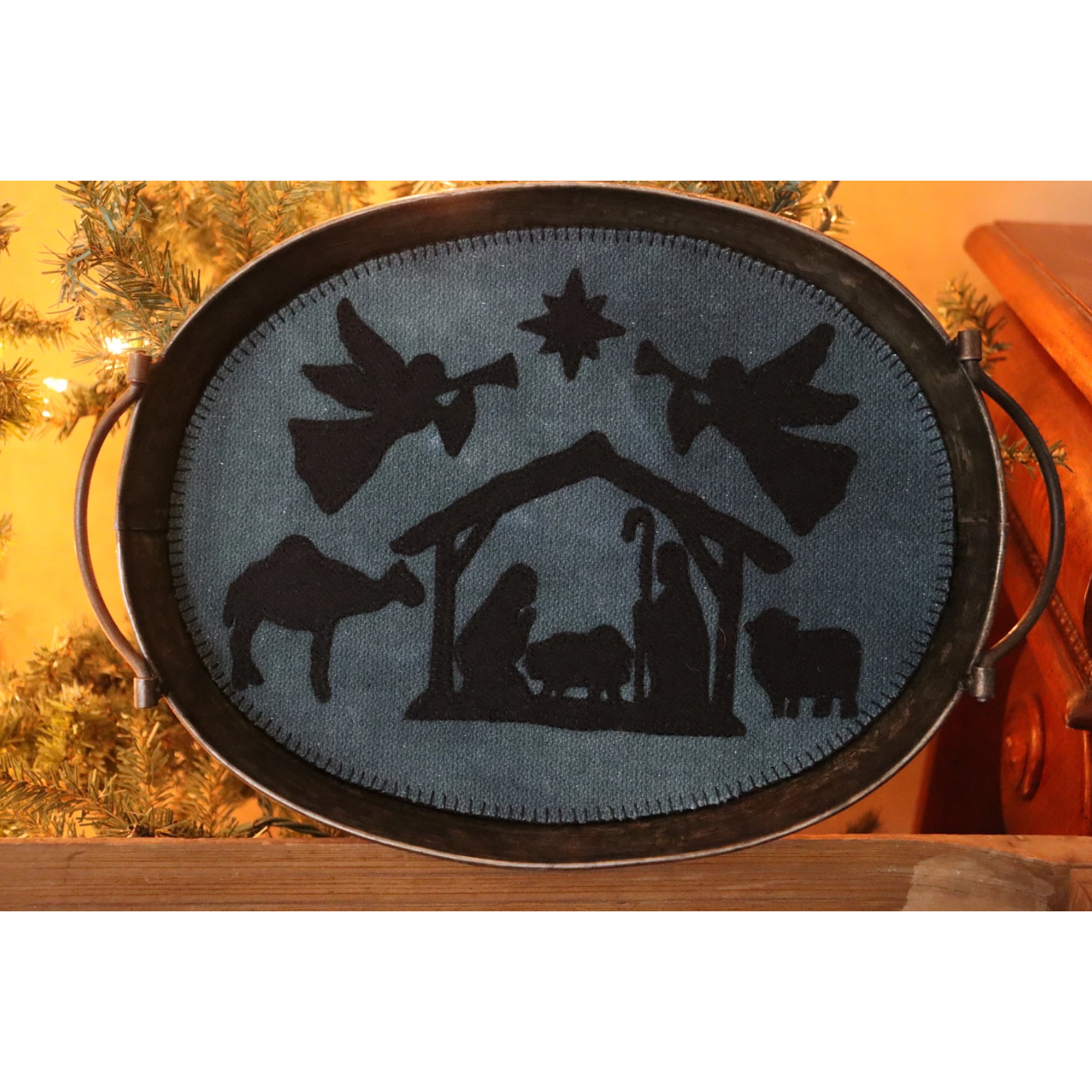 Made on a blue sparkle background, this wool applique nativity scene will complete your Christmas decor.