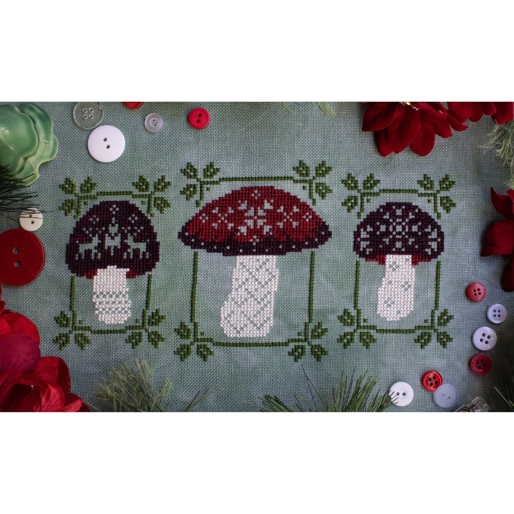 Stitch Count: 35w x 54h (small mushrooms), 47w x 62h (big mushroom), 124w x 62h (stitched together) Model Fabric: 28 ct “Pistachio” cashel linen by Fiber on a Whim Overdyed Colorway Threads (Model): DMC 3345, DMC 3865, Roxy Floss Co Falu Red, and Roxy Floss Co Cheshire DMC Colorway Threads: 498, 814, 3345, and 3865