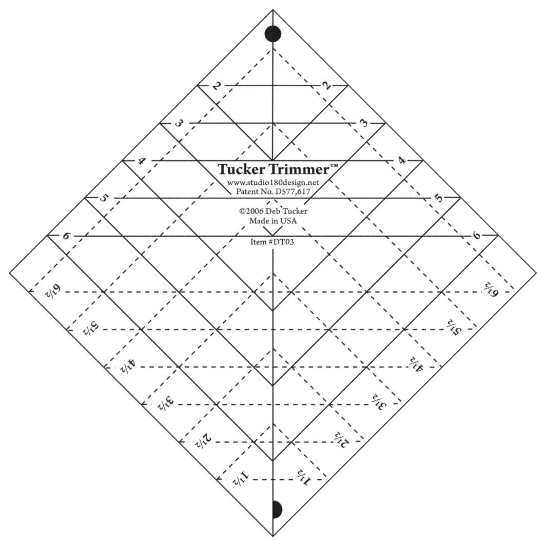 The Tucker Trimmer tool was designed to help quilter’s quickly and easily trim down units that are made with triangles: half square triangle squares, quarter square triangle squares (hourglass units), and combinations of half square and quarter square triangle squares (combination units). It has multiple diagonals which allow you to align ruler guide lines with unit seam lines to quickly locate the exact center of pieced units. This makes trim down easy, precise, and perfect every time. No more figuring, or guessing, or struggling to find a center point. I use it for much more than just trimming however and consider it my “must have” tool every time I head to my cutting table.