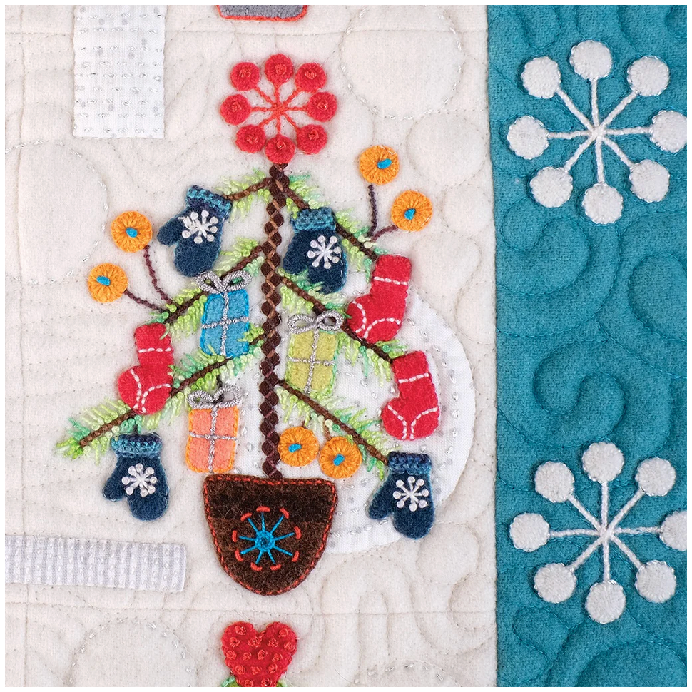 Tinsel is a continuation of Sue's small studies and a celebration of the modern Christmas tree. Though the true Christmas tree tradition can be traced back to Germany, today many people around the world embrace the custom in their own distinctive ways. Tinsel is a celebration of this unique holiday tradition and a symbol of joy, unity, and gathering. With Sue's detailed instructions and guidance on basic background layering techniques, you can teach classes with confidence and ease. Sue provides countless tips and tricks throughout the pattern, which will increase sales of tools and notions. Easily demonstrate how to add textural background stitching and how to enhance each element with expertly selected embroidery stitches, bringing each block to life.
