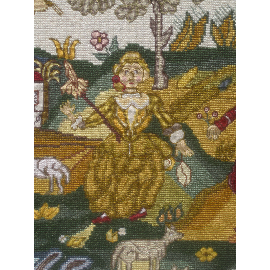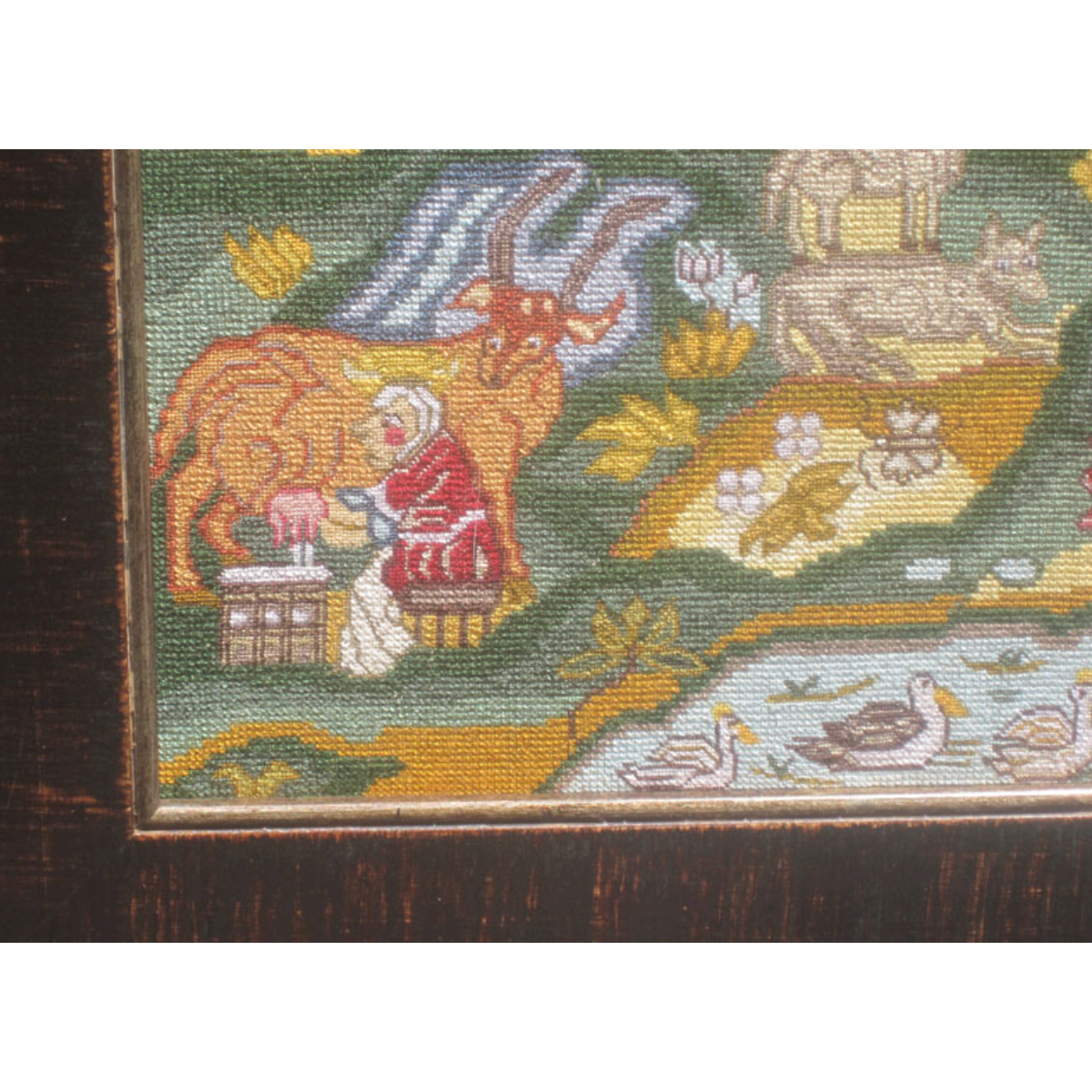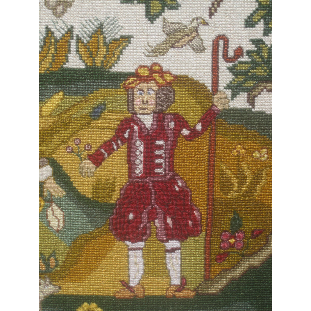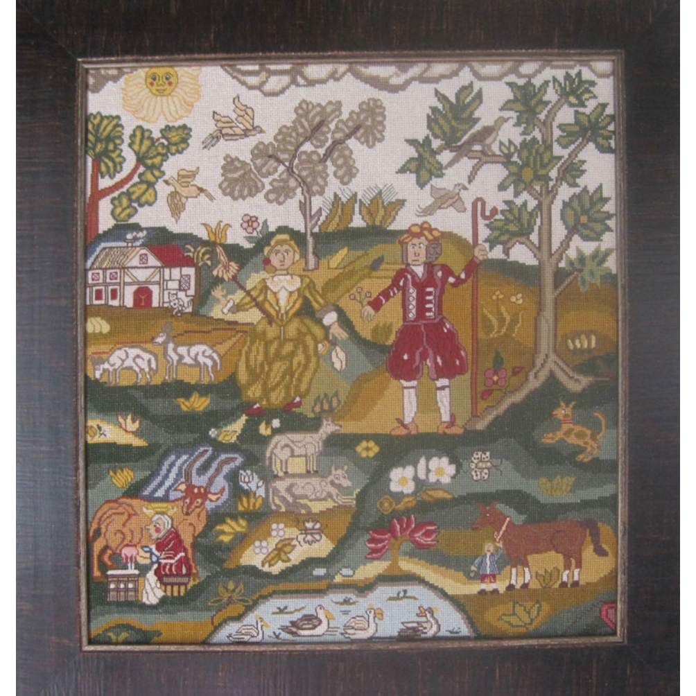 Many of the popular motifs in the ideal landscapes feature in this needlework picture, inspired by early eighteenth century English prototypes. Not only do we have the lovely shepherdess/spinster (she is indeed spinning with a drop spindle traditionally used outdoors while tending to the flock as it is quite portable) with her sheep, an adoring shepherd sits beside her with his sheep crook, his devoted dog at his feet, offering her a small bouquet of flowers. A cat sits in front of a traditional half-timbered farm house, a groom holds a handsome horse, ducks and geese swim in a beautiful blue pool of water, butterflies and birds flit in every direction, oversized flowers and plants blossom in the pasture, and then there is the very eager—slightly manic—milkmaid on her stool, squirting jets of pure white milk into her wooden stave bucket. It simply does not get any more bucolic than this.