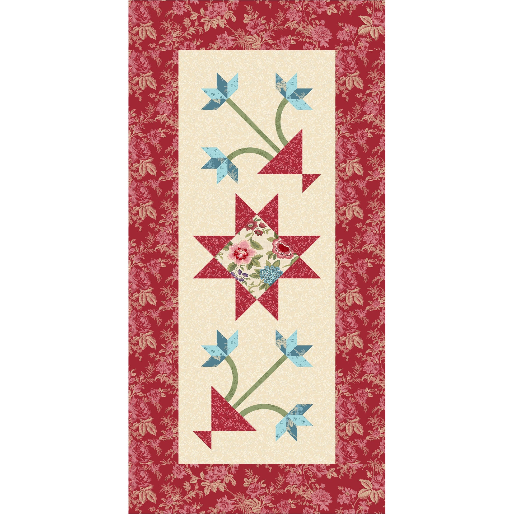 Kit includes pattern and fabrics to make the runner in either the blue or pink colorway as shown.  Fabrics are from the Cottage Florals collection by Kellie Beckwith for Marcus Fabrics